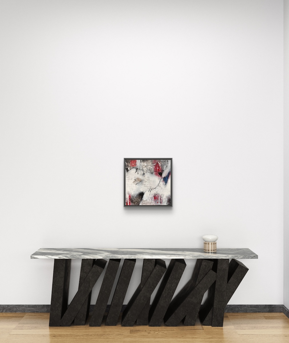 Die im Werk eingearbeiteten Worte bilden das emotionale Zentrum des Mixed-Media-Bildes. Sie sprechen von Gemeinschaft, Austausch und dem unsichtbaren Geflecht, das Menschen miteinander verbindet.
