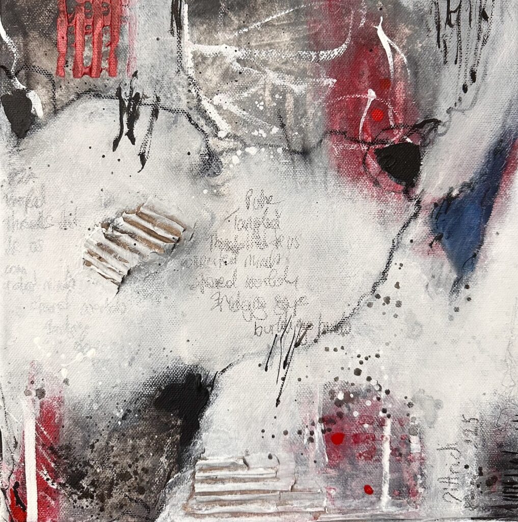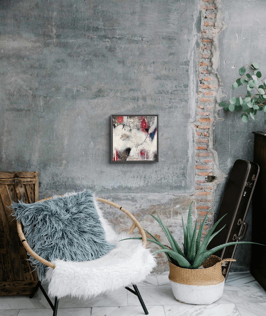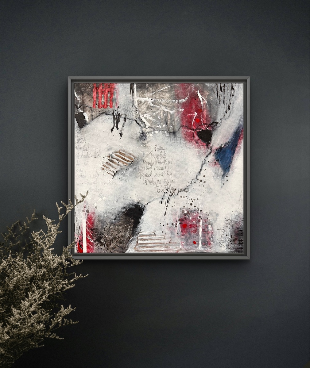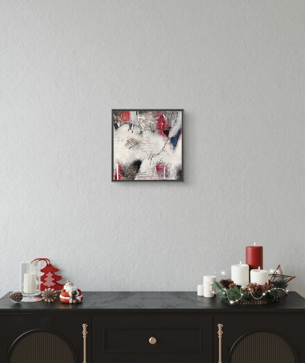 Kräftige Rot- und Blautöne lassen emotionale Momente aufscheinen, während helle Flächen Raum für Offenheit und neue Verbindungen schaffen.